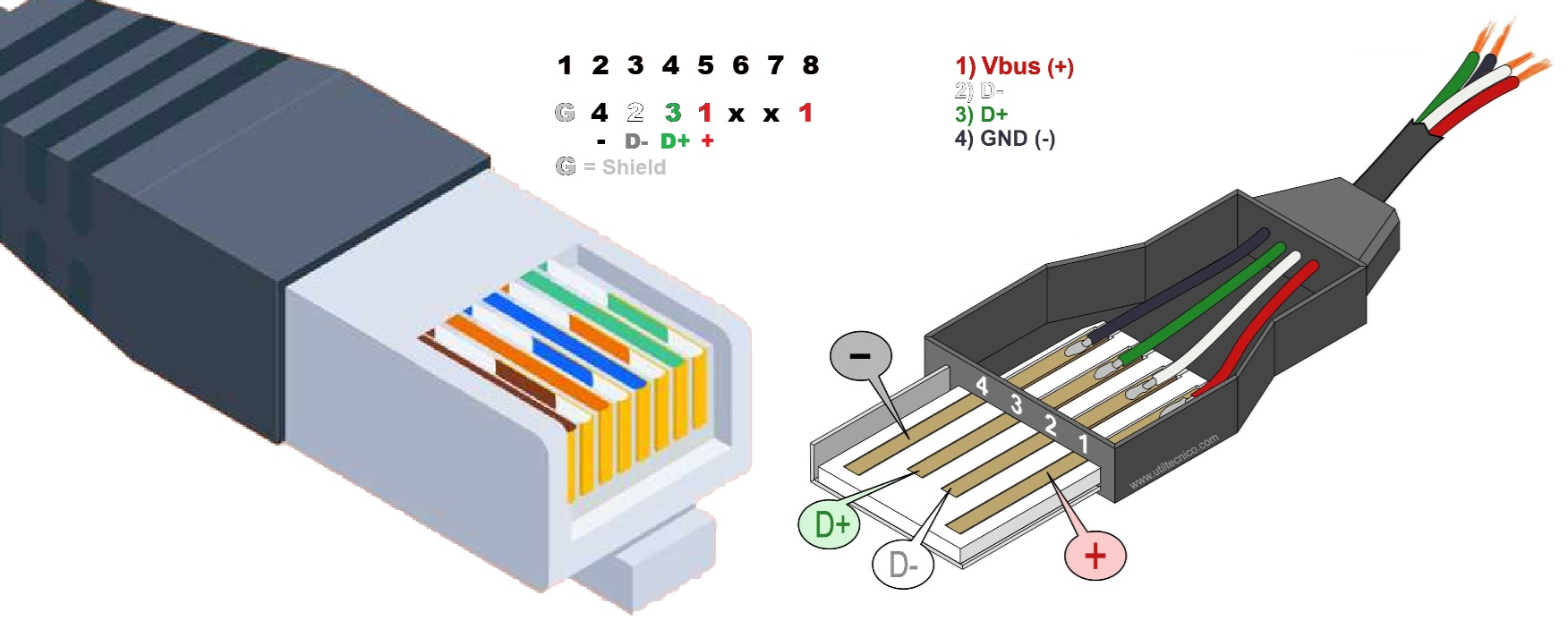The Genovation uses a proprietary 3 foot USB C to Ethernet cable. I tested the connections and discovered it’s wiring is simple, but does require more current than some older or cheaper USB cables have. Here’s the tested wiring diagram: