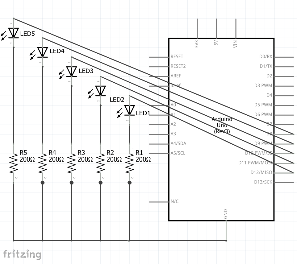 Blink many LEDs with for-loops – schematic diagram, wiring